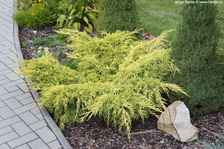 Юниперус (Juniperus × pfitzeriana ‘Old Gold’) е компактен, вечнозелен , известен със своето златисто-жълто оцветяване и разпространено, стелещо се настрани разрастване.